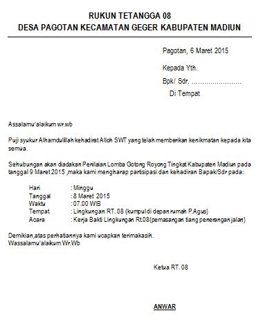 Undangan Kerja Bakti | Masjid Ashabul Kahfi from 1.bp.blogspot.com Lingkungan rt 01 acara : Banyak dari anggota masyarakat bahkan akan berusaha menghindarinya ketika undangan dari rt atau rw meminta mereka untuk ikut serta dalam kegiatan ini. Misalnya saja melalui panggilan telepon ataupun chatting. Setelah membuat undangan musyawarah rt selanjutnya yaitu ketika akan mengadakan kegiatan sebagai contoh kerja bakti, biasanya ketika akan melakukan kegiatan tersebut untuk lebih formalnya ketua rt akan diberikan surat undangan kerja bakti. Di kediaman ketua rt 002. Kerja bakti adalah suata sarana kebersamaan antar warga guna membantu tercapainya kenyamanan desa dengan melakukan pemba. 07 demikian undangan ini kami sampaikan, atas kerjasama yang baik dan semangat kekeluargaan dalam menjaga lingkungan yang aman dan sehat, kami ucapkan terima kasih. Salah satu surat resmi yang sering kali kita temui adalah surat undangan kerja bakti dari rt.